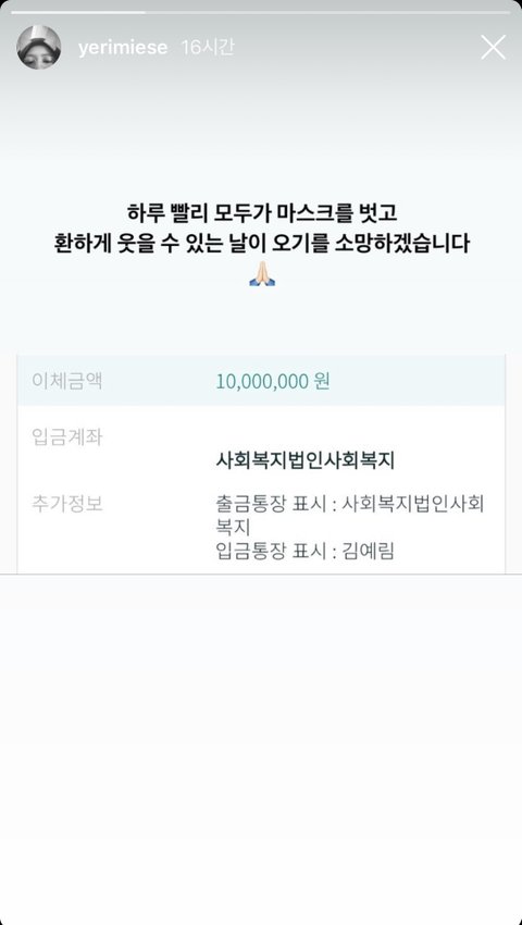 어제 예리가 천만원 기부했다고 인스타스토리 올렸었는데 오늘 사랑의 열매에서 공식 기사 냄