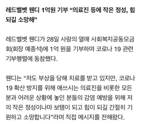 +)) 웬디도 1억 기부ㅠㅠㅠㅠ지금 퇴원하고 통원치료 중이래 빨리 다 나아서 건강하게 보자ㅠㅠ 웬디까지 기부하면서 레드벨벳 멤버 전원 기부했고 총 기부액 2억 3천만원ㅠㅠ