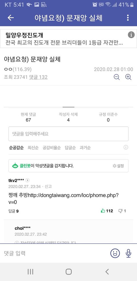 5줄정리하자면:1. 조선족 퇴치부적( 동타이왕 링크. 밑에서 설명 )은 효과가 매우 뛰어남2. 대깨문 대장 김겨쿨의 실체는 조선족 댓글공작부대였음3. 대깨문은 사실상 허상. 대다수의 공작원과 소수의 한국인 멍청이들으로 구성되어있음4. 대재앙이 발생해도 문재인의 지지율이 40%이상 나오는건 다 이 때문임5. 국민 4000만명이 반대한다 하더라도 조선족 댓글부대 동원하여 숫자로 찍어누르기 때문에 언제나 민심과 여론은 여당의 편
