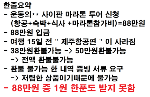 - 88만원 금액에 대한 현금영수증 미발행. -88만원은 ( 제주항공 + 숙박 + 식사 + 마라톤대회 참가비용 ) 인데 그 어떤 내역도 영수증 또는 문서로 받아본바 없습니다. 애초에 발권도 하지 않았더라구요.