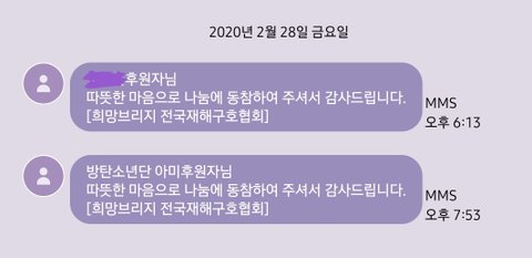 내가 적은 돈이지만 콘서트 갈 돈으로 재해구호협회에 기부를 했는데 방탄소년단 아미 이름으로 한번 더 하고 싶은데 어떻게 바꿀 수 있는지 알 수 있을까?ㅠㅠ