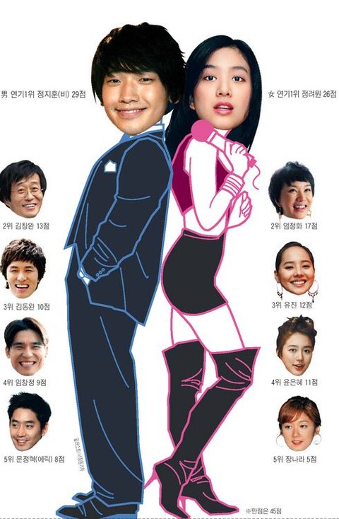 먼저 남자 부문. ‘상두야 학교 가자’, ‘풀 하우스’, ‘이 죽일 놈의 사랑’에 출연한 정지훈(비)이 압도적 성적으로 1위에 올랐다. 29점. “흡인력 있는 내면 연기와 자연스러운 변신으로 대중적 호감을 얻었다”, “이런 친구가 가수로만 활동했다면 큰일 날 뻔했다. 보석”, “말이 필요 없다” 등 극찬이 쏟아졌다. 하지만 “‘풀 하우스’에서는 좋았지만 ‘이 죽일 놈의 사랑’에서는 보기 버거웠다”, “스타성이 자신을 가둘 수 있는 틀이 될 수 있다”는 고언도 따랐다.