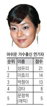 인기 드라마 주인공 중 태반이 가수인 시대, 한국 드라마 전문가들은 어떤 평가를 내리고 있을까? 유명 드라마 작가, pd 15명을 상대로 “누가 최고의 가수 출신 연기자인가?”를 묻는 설문조사를 벌였다. 문항별로 1~3위를 적어달라고 했고, 합산은 1, 2, 3위에게 각 3, 2, 1점을 주는 방식으로 이뤄졌다.