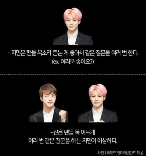 지민은 팬들 목소리 듣는게 좋아 같은 질문을 여러번 하지만 진은 팬들 목 아프게 여러번 질문을 하는 지민이 이상하다고 생각한다