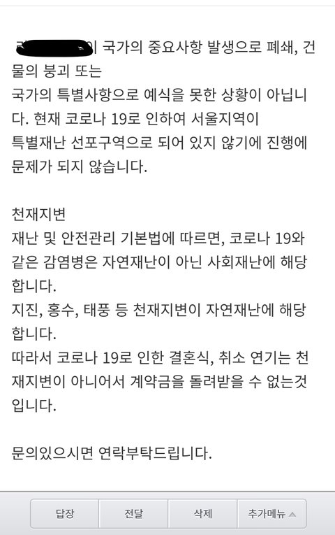계약서에서 말하는 국가 중요사항의 발생에 대하여 웨딩홀측에서는 어떤 식으로 해석하는 건지 알고 싶어 홀측에서 말하는 국가중요사항의 발생이 어떤 것을 의미하는지 가지고 있는 약관이나 매뉴얼(?)이 있으면 서면자료로 보내달라는 요청을 하였더니 이런 답변을 받았습니다.