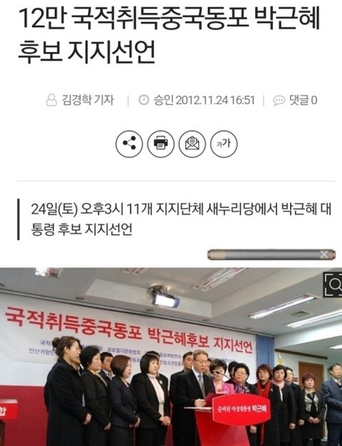 근데 이게 아주 교묘한 거짓말 물타기인게사실 조선족들은 대선때 문재인이 아니라 박근혜 지지선언했었음.