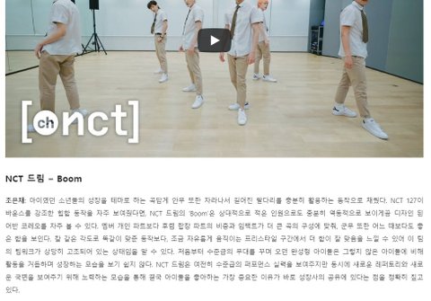 조은재: 아이였던 소년들의 성장을 테마로 하는 곡답게 안무 또한 자라나서 길어진 팔다리를 충분히 활용하는 동작으로 채웠다. NCT 127이 바운스를 강조한 힙합 동작을 자주 보여줬다면, NCT 드림의 ‘Boom’은 상대적으로 적은 인원으로도 충분히 역동적으로 보이게끔 디자인 된 어반 코레오를 자주 볼 수 있다. 멤버 개인 파트보다 후렴 합창 파트의 비중과 임팩트가 더 큰 곡의 구성에 맞춰, 군무 또한 어느 때보다도 좋은 합을 보인다. 칼 같은 각도로 똑같이 맞춘 동작보다, 조금 자유롭게 움직이는 프리스타일 구간에서 더 합이 잘 맞음을 느낄 수 있어 이 팀의 팀워크가 상당히 고조되어 있는 상태임을 알 수 있다. 처음부터 수준급의 무대를 꾸며 오던 완성형 아이돌은 그렇지 않은 아이돌에 비해 활동을 거듭하며 성장하는 모습을 보기 쉽지 않다. NCT 드림은 여전히 수준급의 퍼포먼스 실력을 보여주지만 동시에 새로운 레퍼토리와 새로운 국면을 보여주기 위해 노력하는 모습을 통해 결국 아이돌을 좋아하는 가장 중요한 이유가 바로 성장사의 공유에 있다는 점을 정확히 짚고 있다.