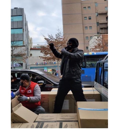 검정 마스크와 검정 비니를 쓴 채 마스크를 배부 중인 김보성