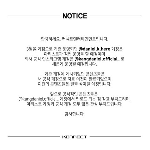 커넥트 공계 새로생기고 https://instagram.com/kangdaniel.official_ 원래쓰던 계정은 강다니엘 개인인별로 쓴대 ㅁㅊㅁㅊㅁㅊ