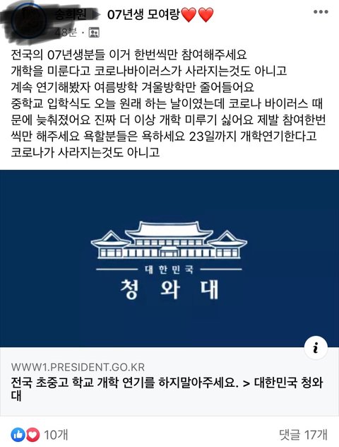 지네 개학 미뤄지는거 싫어서 개학연기 하지말아주세요 ㅇㅈㄹ 하면서 청원 올리네 ㅋㅋ 좋아요 수는 별로 없어도 저기 들어가보면 1000명 넘게 동의함 ㅋㅋ ㅂㅅ인가