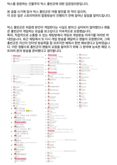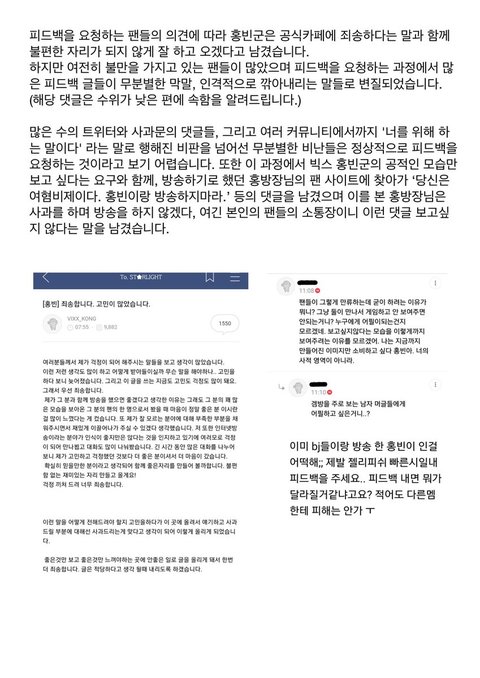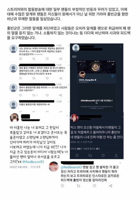 2019년 3월에 게임방송 시작하고 반대하는 팬들 악플은 더 심해졌고홍빈은 트위치 트게더로 팬들과 소통하고 그외는 끊어버림.2019년 빅스 콘서트해서 팬들한테 여전히 따듯한 멘트 해주고 아이돌 홍빈으로너무 즐거워하는게 느껴져서 괜찮아졌다고 생각하게 됨.근데 공식카페 악플 사건 이후로 팬들에게 자기방어적 적대적 장벽을 치고 있다고 느낀게새해 설날 등등 기념일에 공식카페에 팬들한테 글도 안 올리고, 트위치 트게더에만 올림.