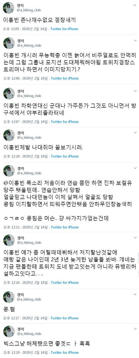 2018년 빅스 공식카페 악플 사건 이후로 홍빈이가 변해버린거 같음.홍빈이가 공식카페 팬들을 적대적이게 느낄 만한 사건이 있었음2018년에 홍방장 이라는 스트리머 만났다고 홍빈이가 악플 심하게 받아서빅스 공식카페에서 까지 너무 심하게 욕하고 트위터, 인스타그램에 직멘 심하게 받고홍빈이가 그때 공식카페 예전에 올린 글, 인스타그램 사진도 삭제하고 차단한 적 있음.탈퇴하라고 5인지지 하는 무리들도 생기고, 데뷔 후에 팬들에게 악플을 심하게 받음.