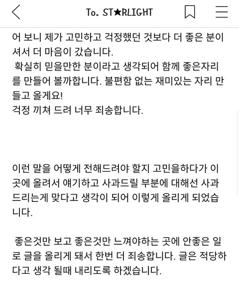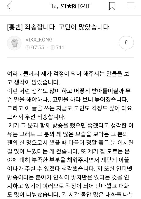 이 사건 이전에는 공식카페에서 따뜻한 말들 많이 해주고 그랬는데.이 시건 이후로 공식카페에 글도 딱 2개 올리고 팬들하고 공카 채팅도 안함.이 악플 사건 이후로 많은 게 변해버린거 같음. 공식카페라는게 연예인들이 마지막 내편이라는게 있는 곳인데공식카페 댓글에서 까지 탈퇴하라고 미친 댓글 많았음.저 사건이 팬들이 공식카페에 빅스 탈퇴까지 언급할 정도인가 하고홍빈이 충격과 배신감 상당히 느꼈을거 같고 팬들을 적대적이게 느꼈을거 같음.팬들도 연예인한테 믿음이 깨져서 현타가 오듯이, 연예인들도 팬들한테 현타가 올 때가 있을 거임.그래서 홍빈이 공식카페에 더이상 글을 올리지 않게 된거고.2019년05월24일 늘 챙겨왔던 빅스 데뷔일에 어느 곳에도 글을 안올림.2차 술방 사과문도 트위치 트게더, 인스타그램에만 올렸음.