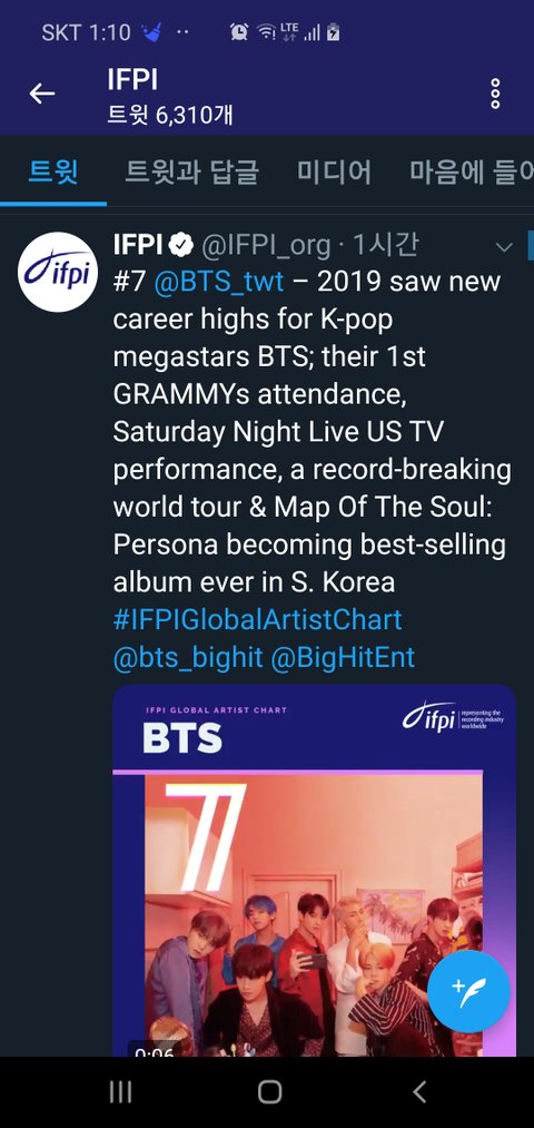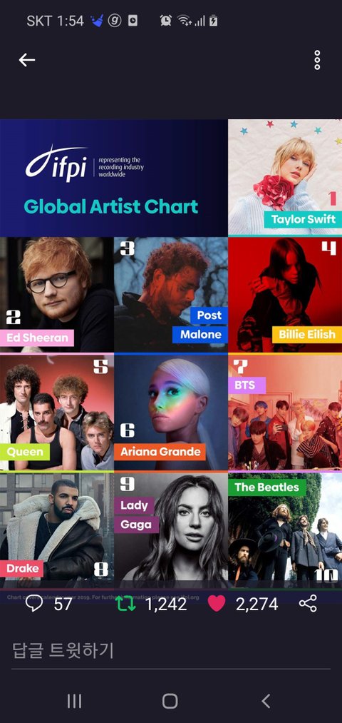 2019년 IFPI 아티스트 7위했어.2018년에는 2위했었는데 그때는 빌보드200 두번이나 1위했었으니까. 방탄소년단 축하해!