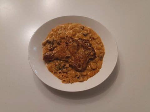 전날 남은 치킨다리에 우유와 파프리카가루 팍팍넣고 끓인 원팬파스타