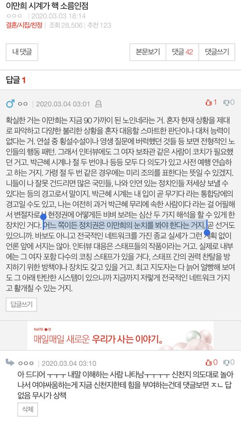 응? 지네 교인들한테도 신천지라고 티내고 다니지말라던 양반이 전국으로 반영되는 사과문에 정치색을 저렇게 대놓고 표현한다구??? (저는 태극기 박근혜 옹호자입니다 근혜야 같이 죽자^^)