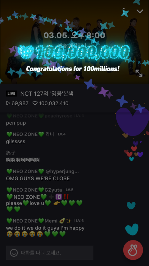 우리 1억 축하해 !!!!!!!! ♥️♥️ 우리 애들이 좋아할거 생각하니까 너무 뿌듯하고 좋다 애들 방송할때까지 조금만 더 힘내고 우리 이번에 스밍도 확실하게 열심히 하자 ㅠㅠㅠㅠㅠㅠ 사랑해 즈니들 외즈니들듀 최고