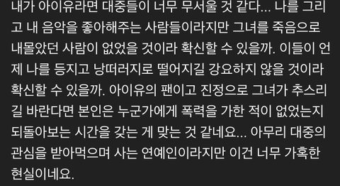 이 댓글이 너무 맞는거 같음 수많은 팬을 보유하고 있는데 자기 팬들이 자기가 받은 악플을 다른 연예인에게 썼다고 생각하면 진짜 감정 애매할듯 분명 아이유도 악플 때문에 괴로워하고 고통스러운 날들을 보냈을텐데 분명 자기 팬들 중에도 그런 악플러들이 없다고 장담은 못할텐데 그 사람들이 아이유가 받은 고통을 다른 사람에게 줬다고 생각하면 참 팬이라는 존재가 고마운 존재이기도 하지만 무서운 존재이기도 할듯 지금당장은 내가 노래 부르고 춤을 추면 좋아해주지만 또 막상 언제 떠날지 또 언제 내 불행을 바랄진 모르는 일이니까..