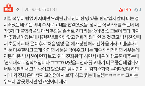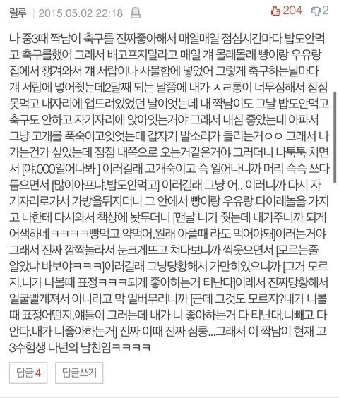 점심시간에 나 좋아하는 거 ㅈㄴ 티나는 남사친이랑 말하다가 얘기가 나와서 야 왜 다들 남녀사이에 친구 없다하지? 했는데 얘가 나 빤히 보더니 없지 그럼... 이러는거임 그래서 내가 얘가 나 좋아해서 이러는 거 아니까 반응보려고 ㅋㅋㅋㅋ 왜~ 우리도 걍 친구잖아 ㅎㅎ 이랬더니 걔가 몇초 표정 안좋다가 내 볼 툭툭 치더니 웃으면서 먼저 간다~ 하고 갑자기 나감... ㅋㅋㅋㅋㅋㅋ 근데 난 얘가 나 좋아하는거 아니까 개귀여운거임 나도 호감 있었거든 그래서 고백하려고 그날 저녁에 집앞으로 할말있다고 불렀는데 사귀자는 말이 도저히 안나오는거야 근데 또 내가 불렀다고 ㅈㄴ 좋아하면서 뛰어나온것도 개귀엽고ㅠ 그래서 걍 볼에 뽀뽀함 근데 얘 반응이 ㅋㅋㅋㅋㅋㅋㅋㅋㅋㅋ 얼굴 시뻘개져서 뭐야? 뭐야?? ... 너 뭐야???? 이것만 반복하는 거야 너무 놀라서 ㅋㅋㅋㅋ 진짜 개웃겼음 그래서 뭐긴 뭐야 사귀자는 거야 이랬더니 울것같이 나 보더니 안아주고 안놔줬음 막 계속 진짜 쩐다... 이러고 ㅋㅋㅋㅋㅋㅋㅋㅋ 지금도 쭉 사귀는즁