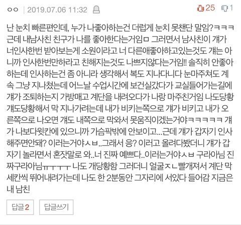 난 아니고 지나가다 본 건데... 여자애가 남자애 사물함 위에 앉아서 발로 사물함 문 못 열게 장난치고 있었는데 남자애가 여자애 번쩍 들더니 공주님 안기로 내려버림.. 학교 난리남 ㅎ