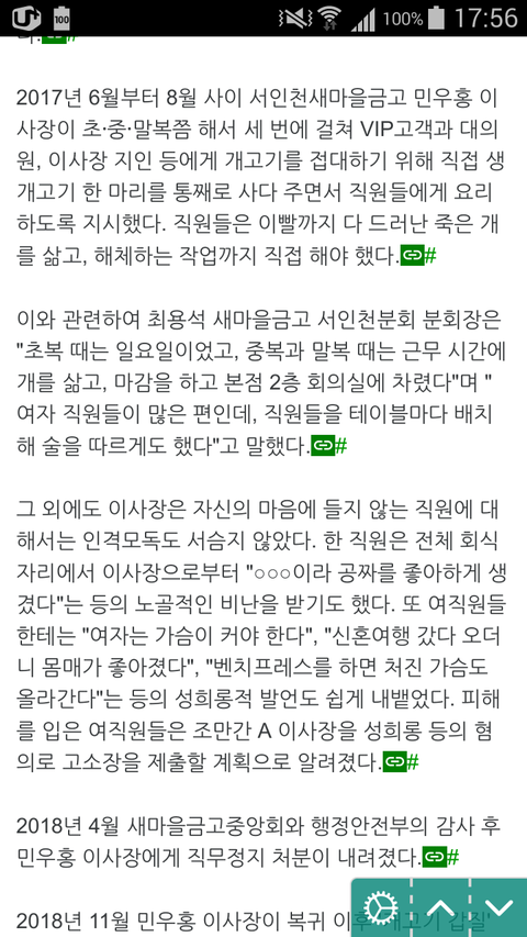 이와 관련하여 최용석 새마을금고 서인천분회 분회장은 "초복 때는 일요일이었고, 중복과 말복 때는 근무 시간에 개를 삶고, 마감을 하고 본점 2층 회의실에 차렸다"며 "여자 직원들이 많은 편인데, 직원들을 테이블마다 배치해 술을 따르게도 했다"고 말했다.#