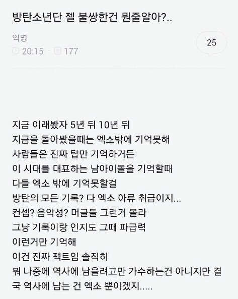 얼굴 엑소>방탄 춤 방탄>엑소 노래 엑소>방탄 랩 방탄>엑소 대중성 엑소>방탄 엑소vs방탄 3대2로 엑소 win 방탄은 군대가면 잊혀질 그룹 중 하나인듯