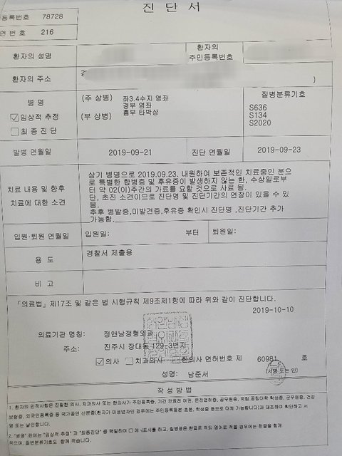 이에 놀라서 저랑 저희일행(친동생과 친구들)이 뭐하는 짓이냐며 전남편을 친정엄마에게서 떨어뜨리려 했고, 그러는 중에 A가 뛰어와서는 말리는 척을 하다가 저희어머니 손가락 잡고 비틀었습니다.