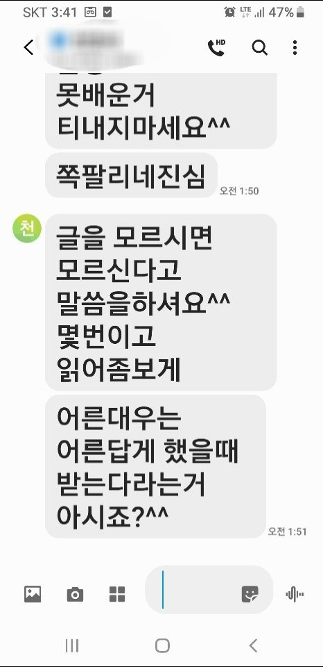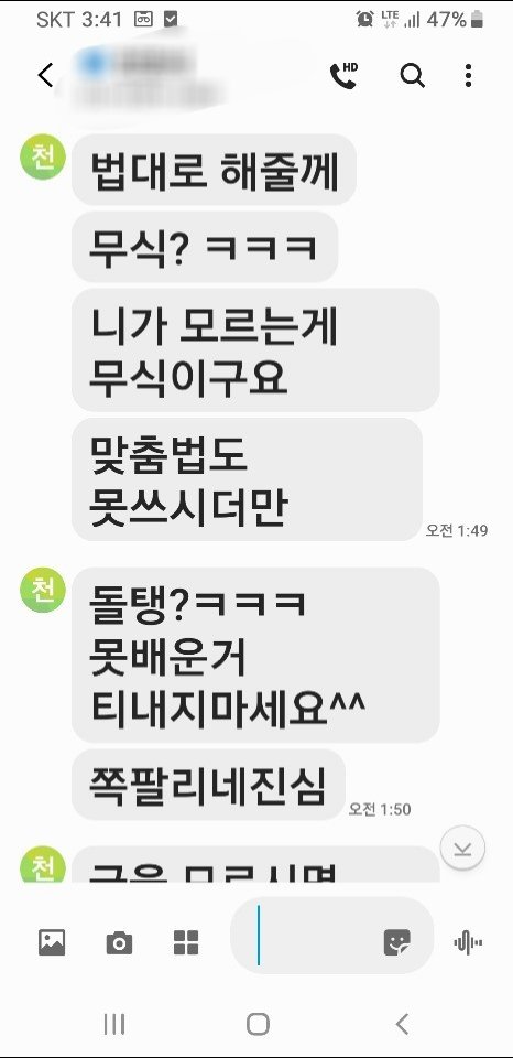 아기를 재우는 중이어서 통화하는 것이 쉽지도 않았을 뿐더라 전남편의 전화이기도 해서 받지 않으려 했더니, 후배들과 함께 돌아가며 계속 전화를 하며 괴롭혔습니다. 계속 전화가 오는지라 2~3번 정도는 받았다 끊기도 했음에도 계속해서 전화를 해왔습니다.