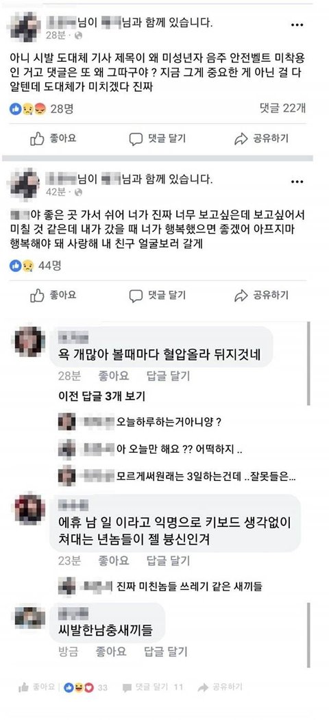 그 가해자 친구들이 (지금 고3) sns에 말도 안되게 추모글 올리길래 도저히 참다참다 못견디겠기에 이런애를 왜 추모하냐고 제대로 알고나 추모하라 했는데 돌아오는 대답은 내친구 착하고 운전자도 아니였고 언니가 뭘아냐면서 걔 제대로 알면 이런막말 못한다면서ㅋㅋㅋㅋ; 자기 죽은 친구는 처벌도 안받았다고 당당히 말하더라 죄없어서^^;;; 내가 입장바꿔서 나중에 너네 부모님도 미짜들 사고에 피해입고 가해자들은 솜방망이 처벌받아도 이럴거냐 물어봤는데 갑자기 우리부모님사고는 왜나와 말 왜 그딴식으로 하냐더라