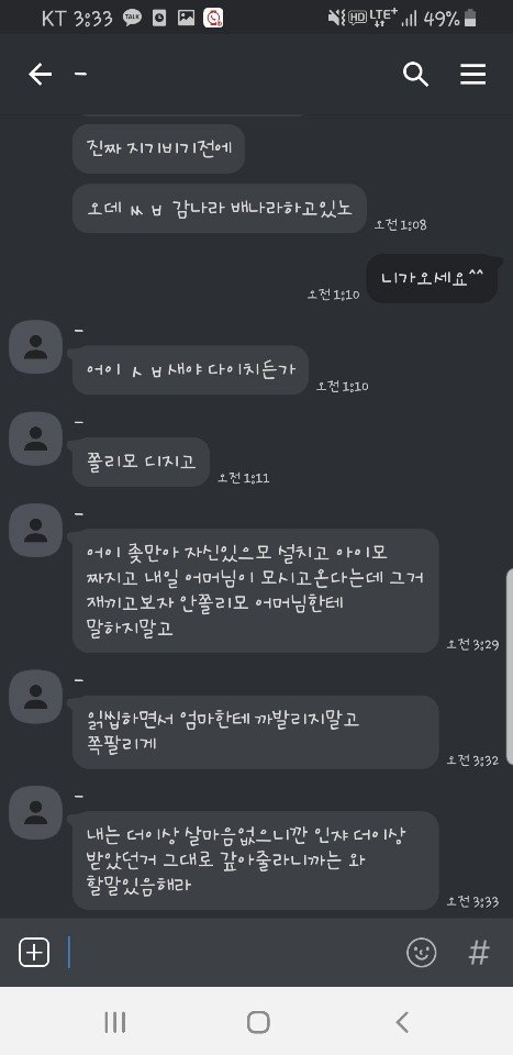 아기를 재우는 중이어서 통화하는 것이 쉽지도 않았을 뿐더라 전남편의 전화이기도 해서 받지 않으려 했더니, 후배들과 함께 돌아가며 계속 전화를 하며 괴롭혔습니다. 계속 전화가 오는지라 2~3번 정도는 받았다 끊기도 했음에도 계속해서 전화를 해왔습니다.