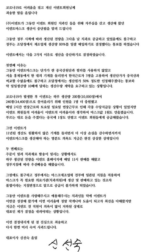 정부에서 마스크 생산업체한테 제조원가의 50%만 주고 가져가려고 하고 거기다가 마스크 생산량 10배 늘리라고함 이덴트 개빡쳐서 마스크생산 중단 선언