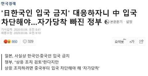 일본도 한국·중국을 함께 묶어서 입국을 차단하고 있어 우리 정부가 중국을 빼놓고 일본만 입국을 차단하려면 명분이 서지 않는다는게 외교 전문가들의 중론이다.