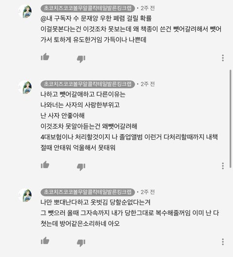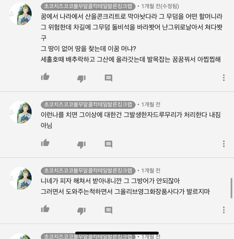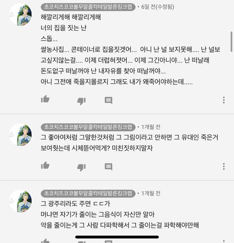 물 7시간동안 찍어먹기 거기 댓글에 이상한 댓글 있길래 봤더니 영상이 올라와있더라 봤더니 영상을 별거 없는데 댓글이 구백몇개야. 몇개빼고 다 지가 반년전부터 쓴거임 하는 말도 완전 이상한 이해 안가는 말이고 어디에 있냐니까 집에 침대에 먼지 발라서 있다는 댓글 남김 ㄷㄷ 어그로라고 치기엔 댓글을 진짜 많이 남기고 6개월전부터 저래 조현병인가 저거