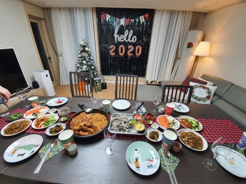 크리스마스 이브날 식탁이 또 거실로 나왔어요.