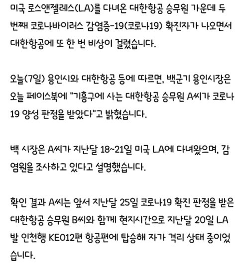 대한항공 승무원 또 코로나19 확진…첫 확진자와 같은 LA 항공편