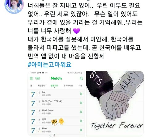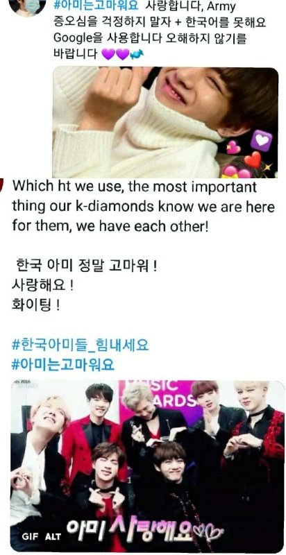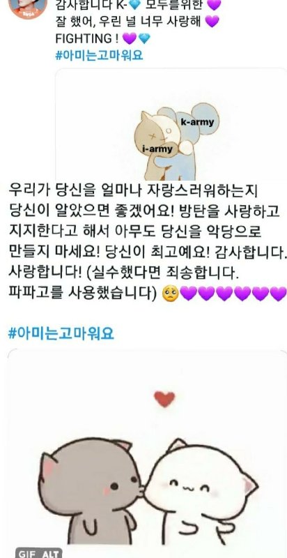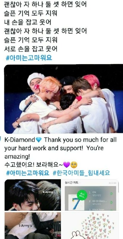 짹늦게봤는데 가끔 일있을때마다 외랑둥이들도 한국아미도 서로 상황들 다 보면서 부둥해주는 거 보면 ㅜㅜ 더 잘해야겠다고 생각함 ㅜㅜ 아미 ㄹㅇ이삐들이야ㅠㅠ ㅎㅇㅌ