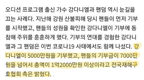 기부의 연대를 경험한 강다니엘과 그 팬덤은 이번 코로나19 사태에서도 함께 나섰다. 강다니엘이 5000만원을 기부했고 팬들의 기부금이 7000만원을 넘어서 총액이 1억2000만원 이상이라고 전국재해구호협회 측은 밝혔다.