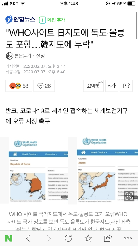 세계에서 코로나 때문에 WHO에 집중하고 있을때 WHO가 독도를 일본 지도에 포함시키고 한국 지도에는 누락시켰대