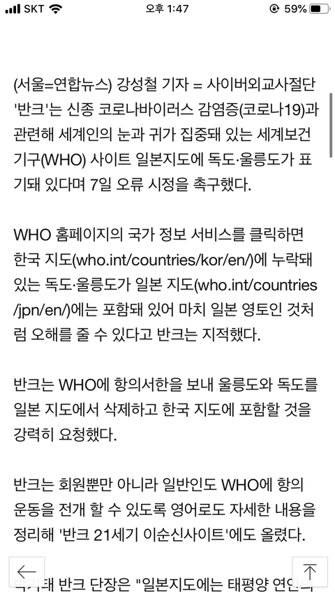 WHO 홈페이지에 독도를 일본 지도에 포함시키고 한국지도에는 누락시켰대 코로나로 뉴스도 크게 안나는거 같은데 이렇게 묻히면 안될거 같아