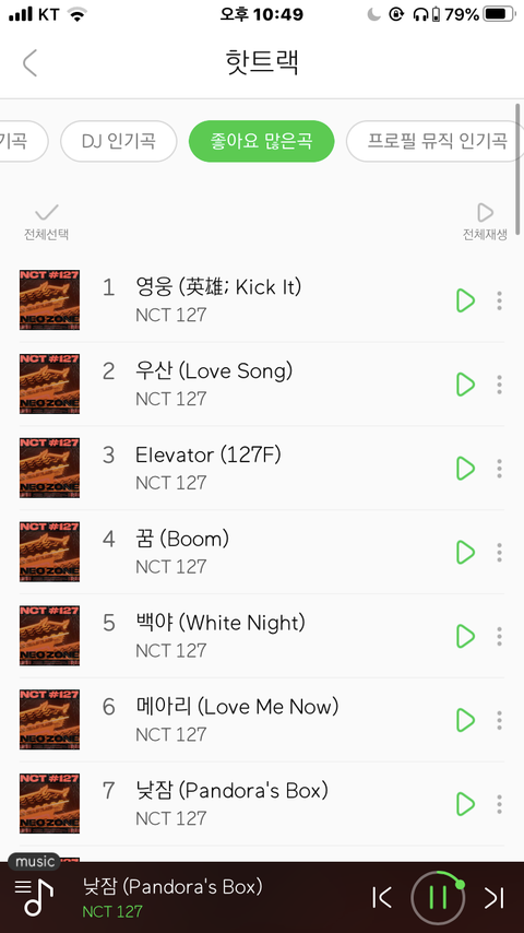 우리 좋아요 많은곡도 1등부터 13등까지ㅜ다 우리꺼임 파친행복 그리고 프로필 뮤직 인기곡은6등!