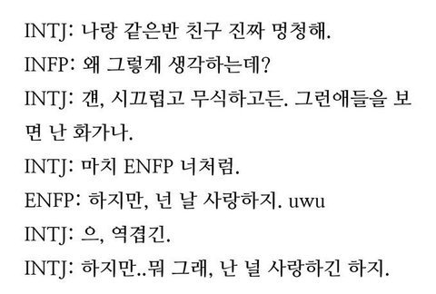 내가 enfp거든! 엠비티아이 관심 없을 때 intj친구를 intj인 줄 모르고 처음 접했을 때 너무너무 끌리더라 나도 신기할 정도로 서로 끌려했어서 나도 속으로 왜 그런가 궁금했는데 엠비티아이 접하고 바로 알았음.. 걔 성격이 빼박 intj고 나는 검사결과 enfp더라ㅋㅋㅋ 너무 신기했음 그 친구랑 지금은 많이 멀어졌는데 어떻게 지내고 있으려나 너무너무 궁금하다 정말 좋아했던 친구였눈데