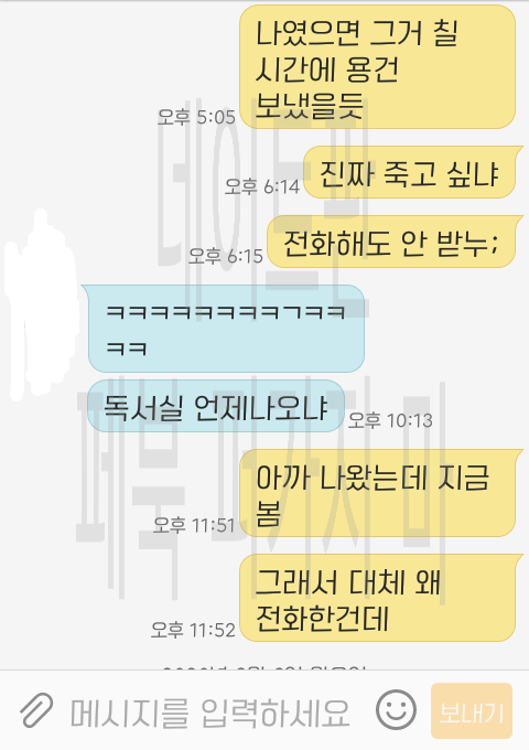 내가 6시쯤에 답답해서 전화 걸었었는데 안 받는 거야; 그래서 내가 문자로 뭐라했어