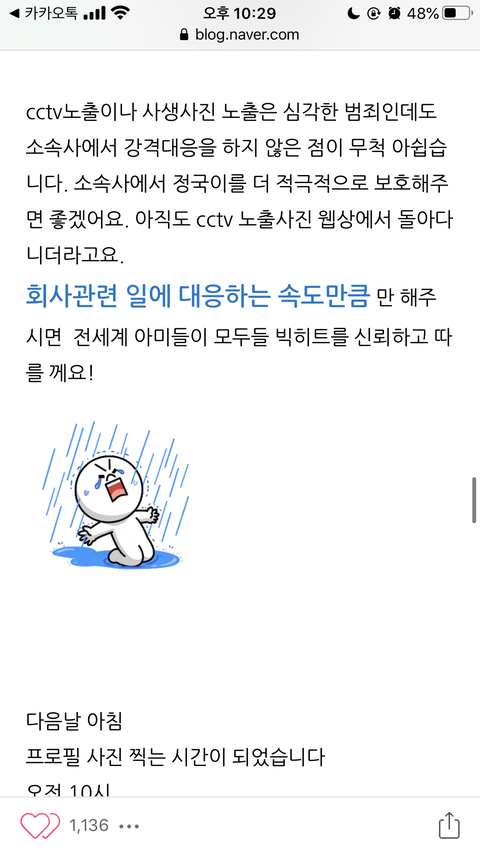 방탄뿐만 아니라 다른 아티스트들에게도 마찬가지구요 한번더 생각하고 글을 썼으면 좋겠습니다