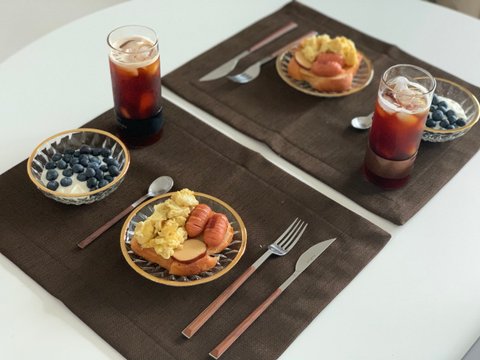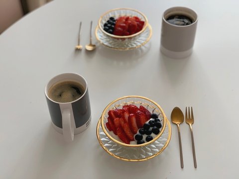 그릭요거트와 좋아하는 과일에 빵과 달걀 소세지는