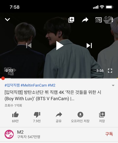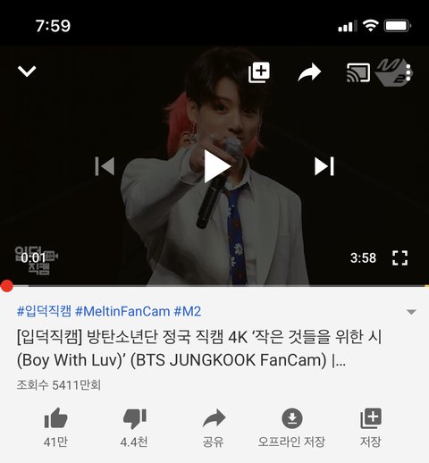 뮤비도 아니고 직캠인데 조회수가 1억ㅋㅋ 다른 직캠들도 천만은 다 넘더라 나 타팬인데도 진짜 대단한거 같아 이번 나온 노래도 좋더라 수록곡도 그렇구