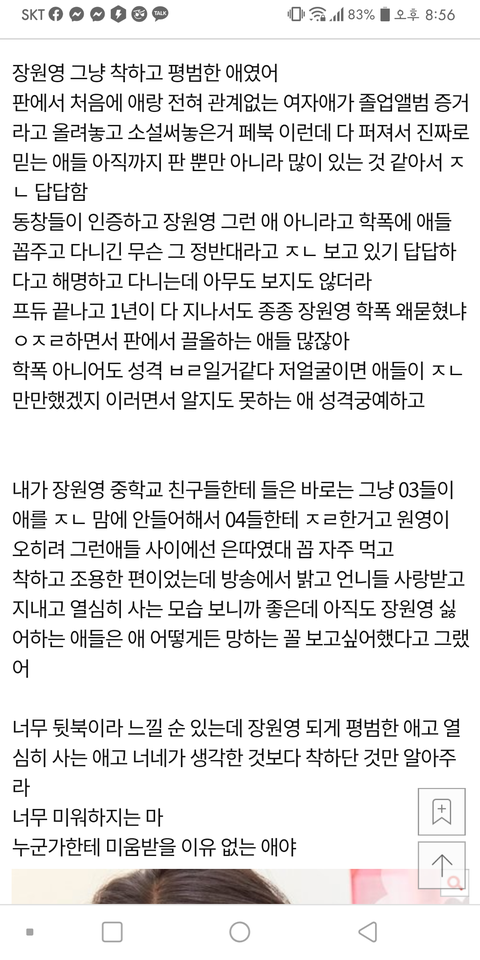 근데 ㅇㄱㄹㅇ인게 내 친구 사촌동생이 장워녕이랑 중학교 같았는데 ㄹㅇ 개조용히 다녔댔음... 친구도 ㅂㄹ없었댔고