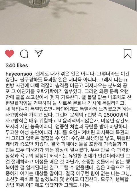 하연수 하고자 하는 말 차분하게 소신껏 말하는 거 멋있다.n번방 사건은 정말 심각한 사건인데 왜 자꾸 묻히는지 모르겠네.국민일보 기자가 잠입해서 기사 쓴 거 있어 다들 봐봐