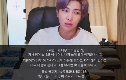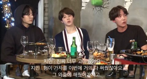 지민 : 진짜 너무 고마웠어요 형이 가사를 이번에 거의 다써줬잖아요