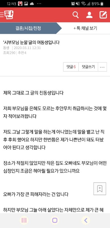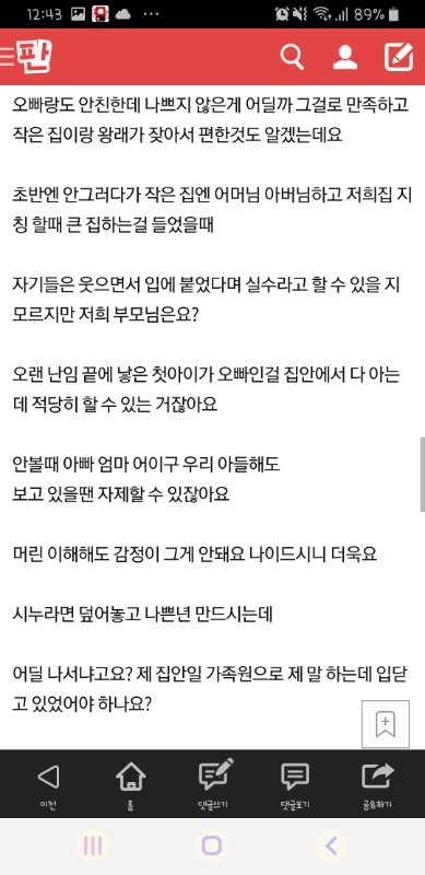 아까 글 보고 진짜 토낄 줄 알았다. 양쪽 다 이해간다는 사람들 보세요. 그래 백번 양보해 딸도 어려울때 같이 산거라 특별한 대접 못받았다 쳐요. 하지만 어린 나이에 가족은요, 함께 있다는 것만으로도 위로 될때가 있는거예요. 근데 토낀년 얘기 다 이해해서 본인도 행복하지 않았다고 해도, 가장 예민한 시기에 부모님과 떨어져 진짜 친부모처럼 대해준 사람들한테 잘하는게 저 글쓴이 오빠의 잘못은 아닙니다. 막말로 저 오빠 입장에서 친부모는 오히려 친척같고 친동생도 친척동생 수준일 수 있다는 거예요. 이거 반대로 글 올라왔으면 아마 오빠분 검은머리 짐승 취급당했을겁니다. 부모가 서운해하는게 가장 큰 잘못이고 그다음으로 자기 연민에 가득찬 동생년이 그자리에서 엎었다는거예요. 그 힘든 시절에 작은아버지 입장에서 조카 키우기 쉬웠을까요? 내가 유부남 입장이지만 내 친조카가 우리집온다하면 우리 와이프보다 내가 먼저 반대했을거예요.