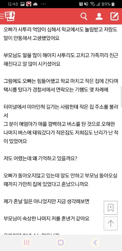 부모 잘못만나 둘다 고생한건 알겠는데 그와중에 작은아버지댁에서 오빠 그늘없이 키워주신건 분명 감사해야할 일이고 오빠가 은혜입은 가족과 허물없이 지내는건 이해해줘야하는 일이지 대놓고 빼앗겼네 서운하네 나설 일은 아님. 시누이라 욕하는게 아니라 생각없이 말한게 잘못이라는 거고 오빠네 부부와는 아마 끝까지 소원하게 지낼수밖에 없을것임